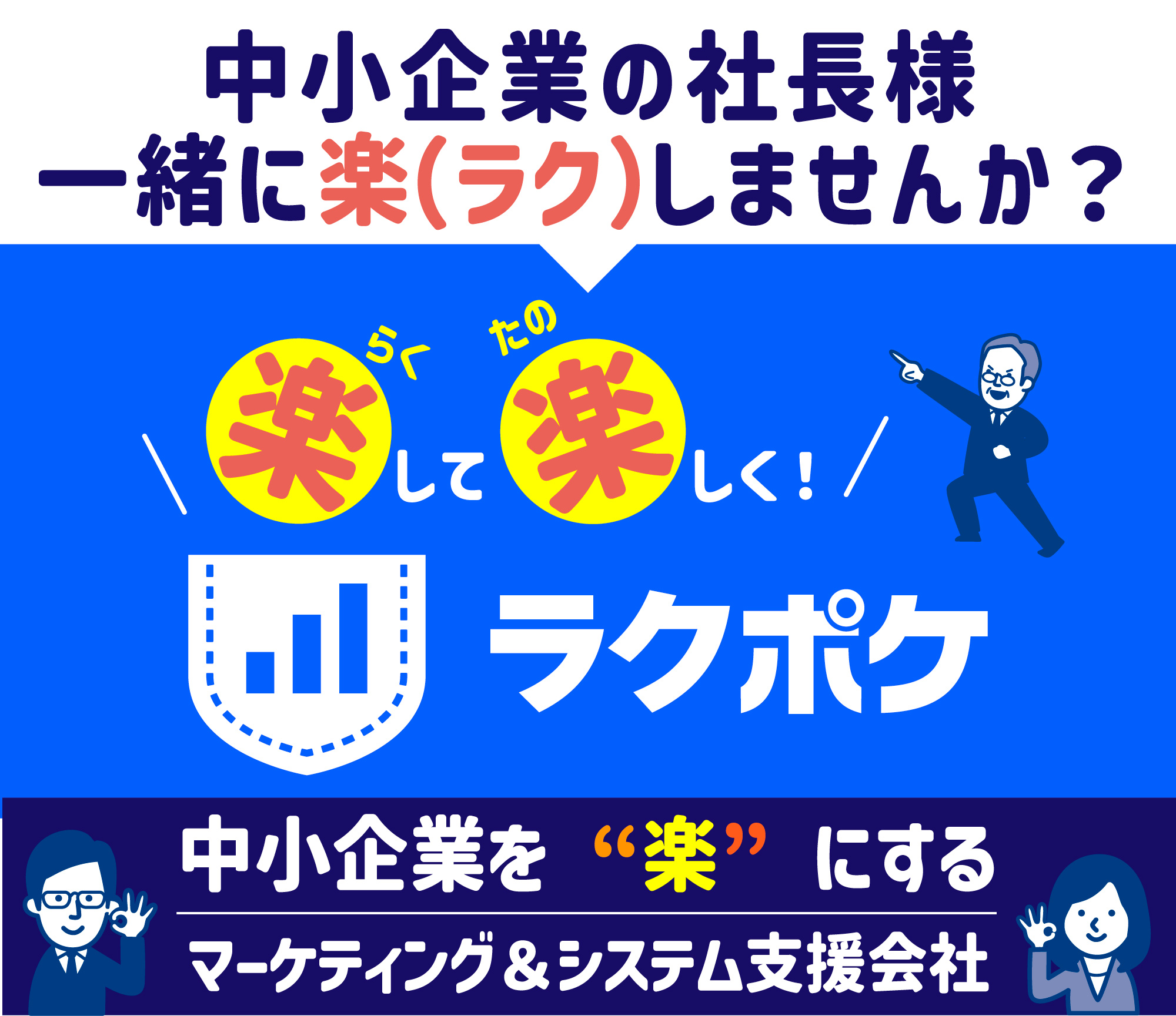 ラクポケは、中小企業の経営者様を対象に、インターネット・マーケティング・デザイン・業務改善(DX)・AI活用まで、トータルでビジネス成長を支援する総合サービスです。