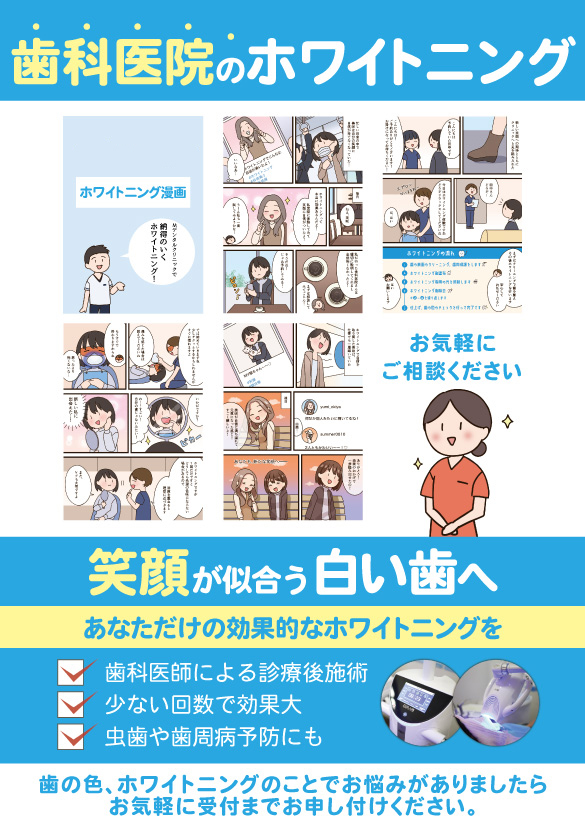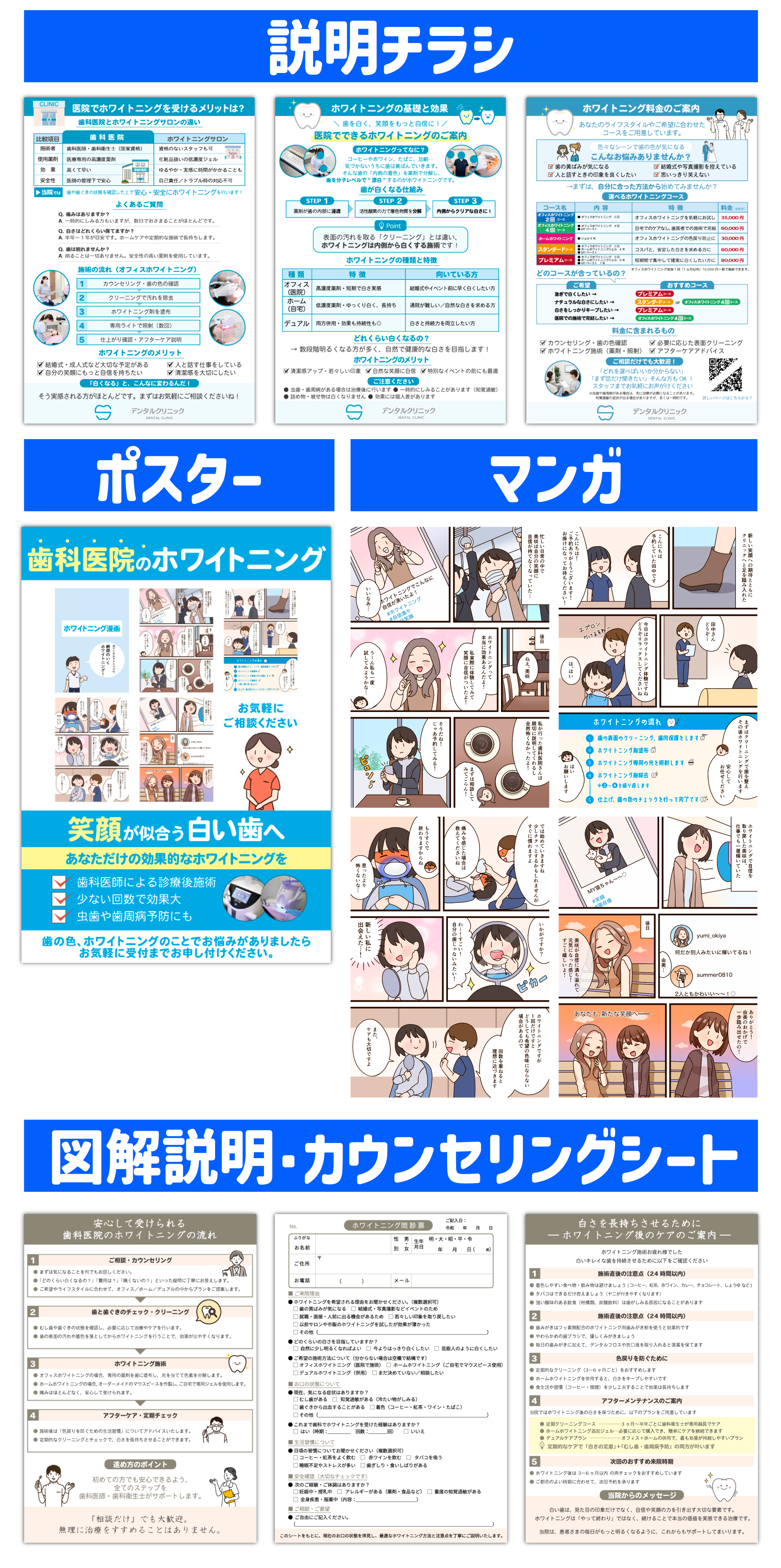 | ホワイトニング | 自費率アップ/気軽な来院導線 | ・院内ポスター ・カウンセリングシート ・診療案内図 ・アフターカウンセリングシート ・診療案内漫画 | 白い歯への関心を喚起 → “美容”感覚での来院を促進。衝動来院にも◎ |