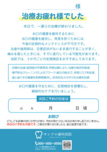 | 予防歯科・定期検診 | リコール率UP/継続率アップ | ・定期健診案内チラシ ・メンテナンスの大切さチラシ | 患者教育ツールとして効果大。スタッフの説明時間も短縮可能 |