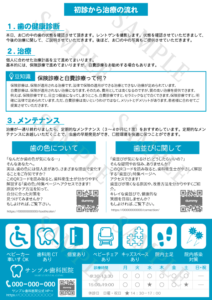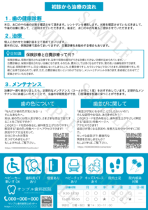 | 矯正(成人・小児) | 検討期間の短縮/カウンセリング促進 | ・矯正の流れチラシ ・親御さんへの案内チラシ | 期間・費用・メリットをわかりやすく。長期治療の不安を解消して受診を後押し |