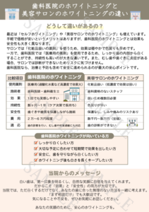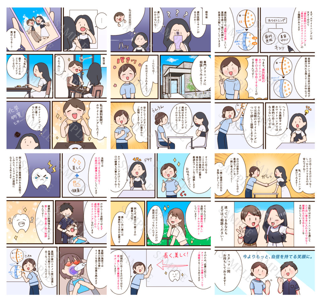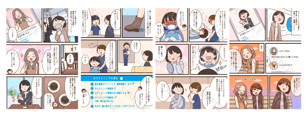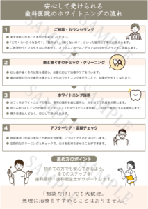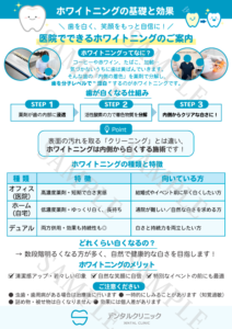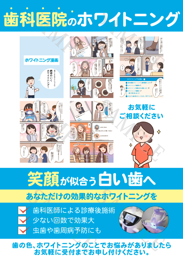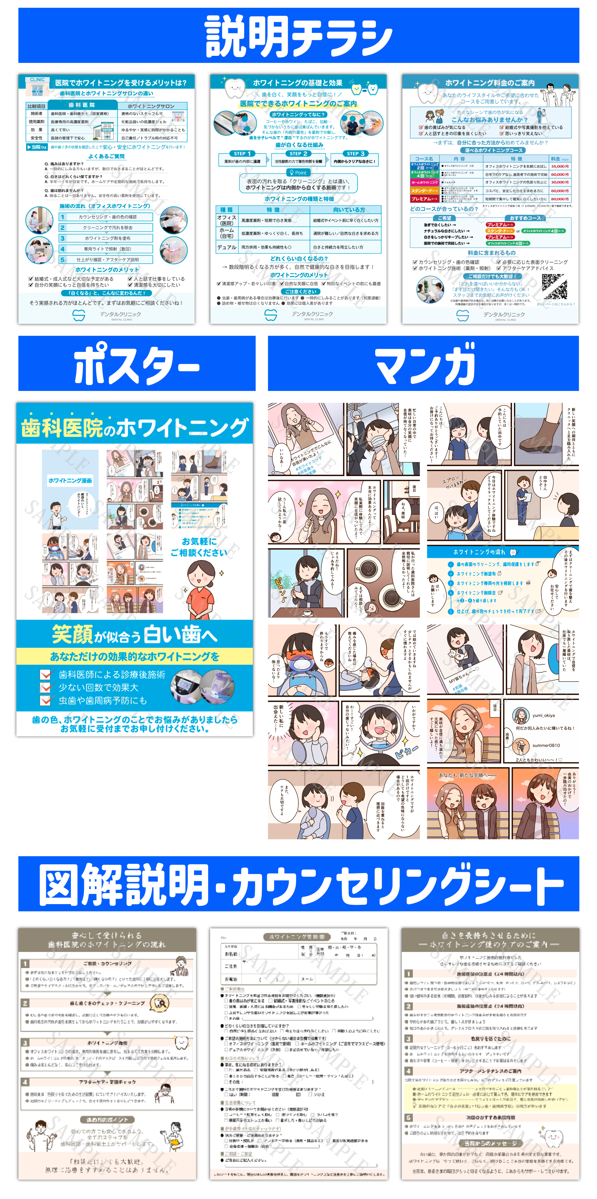 | ホワイトニング | 自費率アップ/気軽な来院導線 | ・院内ポスター ・カウンセリングシート ・診療案内図 ・アフターカウンセリングシート ・診療案内漫画 | 白い歯への関心を喚起 → “美容”感覚での来院を促進。衝動来院にも◎ |