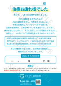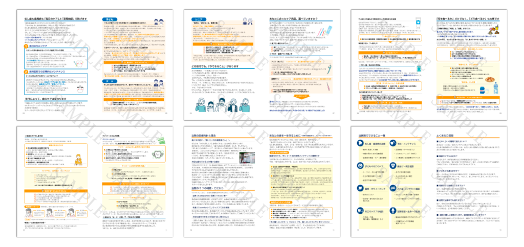 | 予防歯科・定期検診 | リコール率UP/継続率アップ | ・定期健診案内チラシ ・メンテナンスの大切さチラシ | 患者教育ツールとして効果大。スタッフの説明時間も短縮可能 |