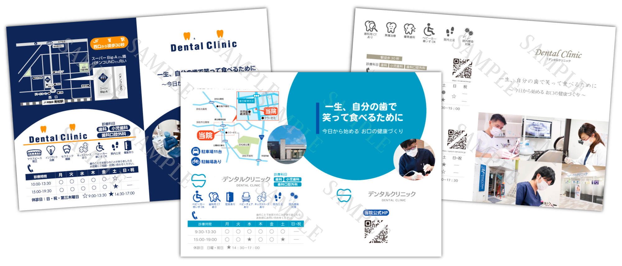 →各診療科目ごとに、最適な販促ルーツ(チラシ、パンフレット、ポスターなど)を用意しています。他医院様で、効果は検証済み。ベースのデザインなどが、すでにできているため、リーズナル、短納期で提供できます。